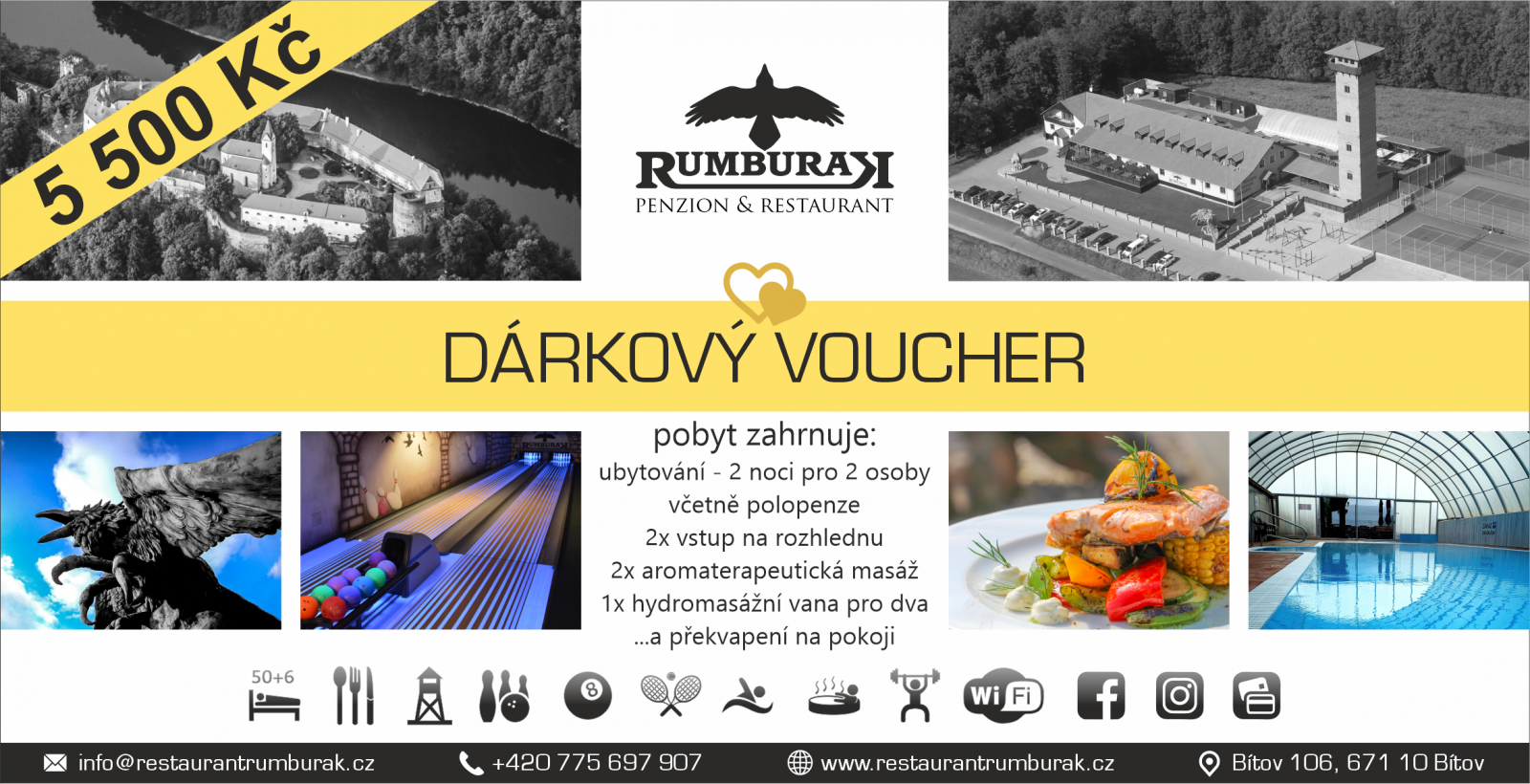 | Penzion | Restaurace | Wi-fi | Fitness | Bowling | Kulečník | Bazén | Masáže | Rozhledna | Whirlpool | Multifunkční hřiště |